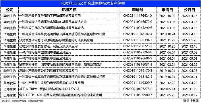 中信证券原料专题报告显示,目前国内化妆品上市公司中,华熙生物的合成生物技术领先行业。除了招牌的玻尿酸,华熙生物利用合成生物学生产的新原料涉及:依克多因、麦角硫因、葡萄糖苷、红景天苷等多种热门天然化妆品成分。
