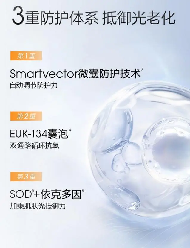 而且珀莱雅云朵防晒还采用了“Smartvector微囊包裹技术+王牌抗氧成分EUK-134+超氧化歧化酶SOD”的自启三重抗氧体系。智能感应紫外线强度、抵抗氧化应激反应、减少ROS对肌肤造成的损害,清除已产生的自由基,降低肌肤氧化压力,增强肌肤光抵御力,是市面上少见的养肤防晒霜,可以为肌肤提供全天抗氧支持。