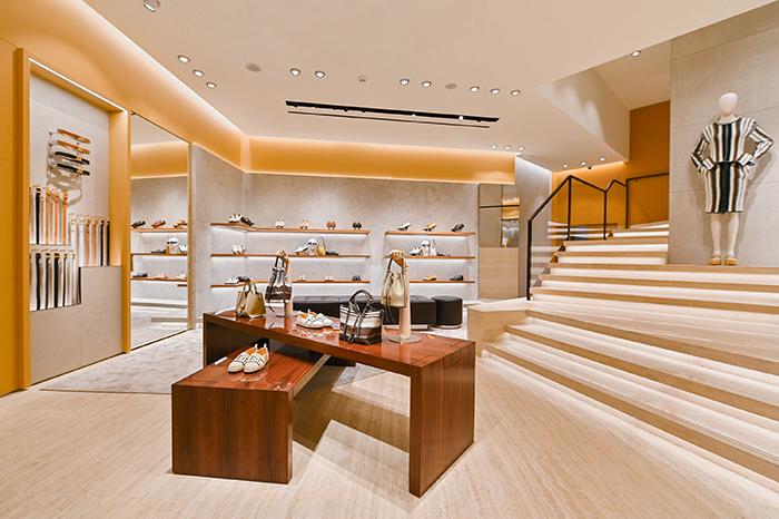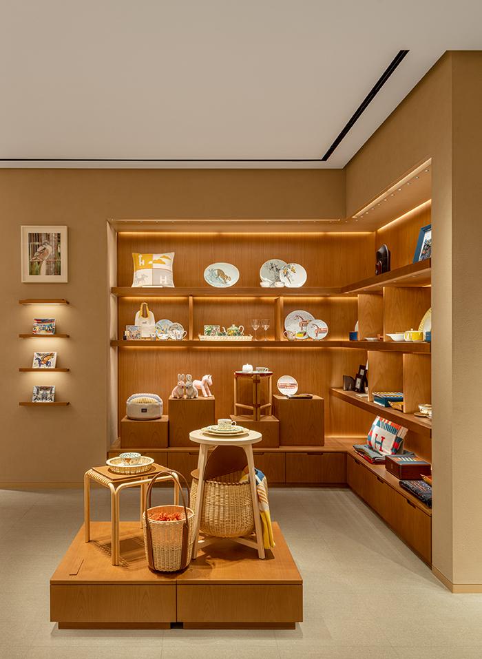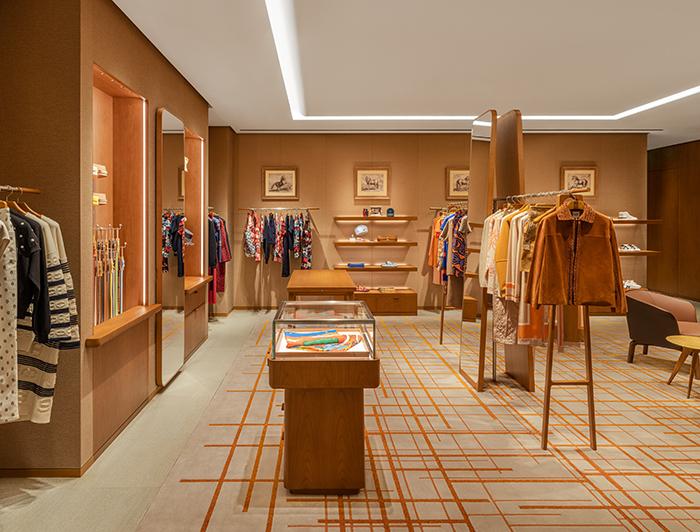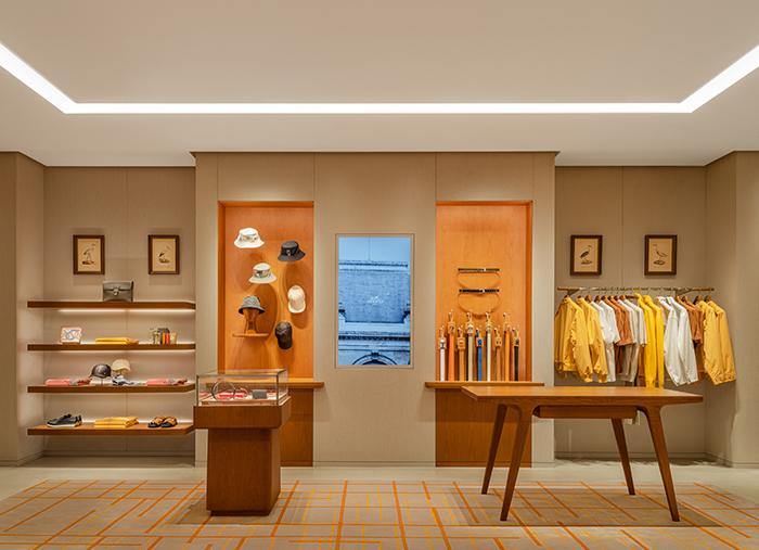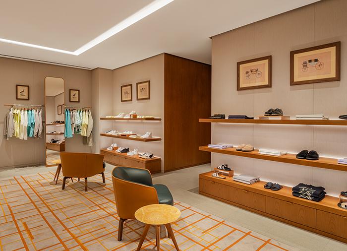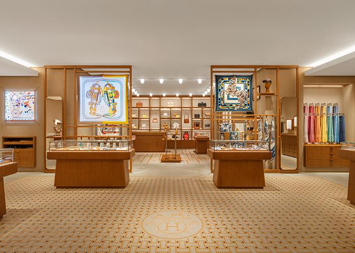 全新专卖店扩至约原有空间的两倍,内部环境更加开阔。店内空间以矩形布局规整排列,划分每个产品区域。自入口步入店内,时尚配饰以及香水与美妆区域分列两侧,进而便可置身女士及男士丝巾区域。向前则是位于专卖店中央的标志性皮具区域,宾客由此可以前往男性区域,亦可经过马术区域前往女性世界和珠宝与腕表区域。