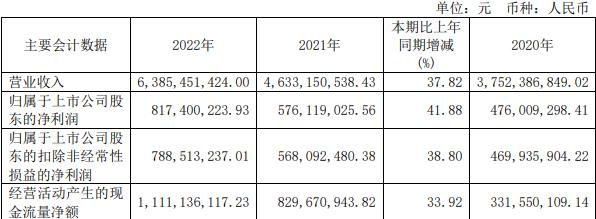珀莱雅昨晚公布2022年年度报告,2022年,公司实现营业收入63.85亿元,同比增长37.82%;归属于上市公司股东的净利润8.17亿元,同比增长41.88%;归属于上市公司股东的扣除非经常性损益的净利润7.89亿元,同比增长38.80%;经营活动产生的现金流量净额11.11亿元,同比增长33.92%。