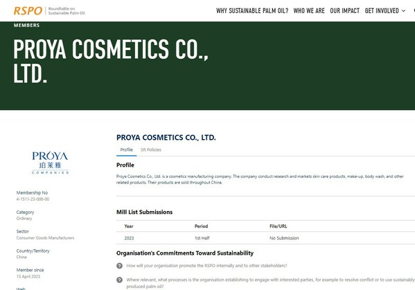 RSPO官网查询页面截图-珀莱雅会员信息