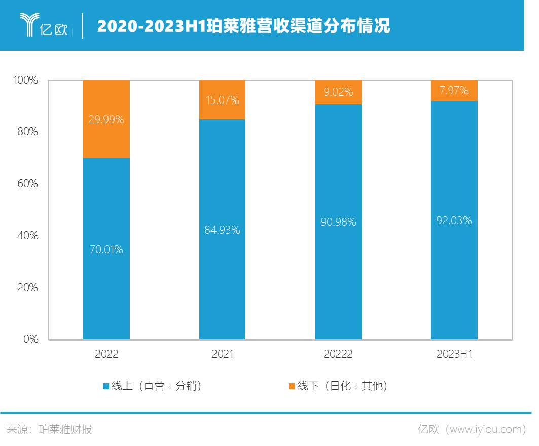 线上渠道在珀莱雅营收中的占比也越来越高。2019年,珀莱雅线上渠道销售额占比首次超过50%;2020-2021年,珀莱雅线上渠道销售额占比稳定在80%左右;到了2023年上半年,珀莱雅的线上渠道营收更是达到了92.03%。