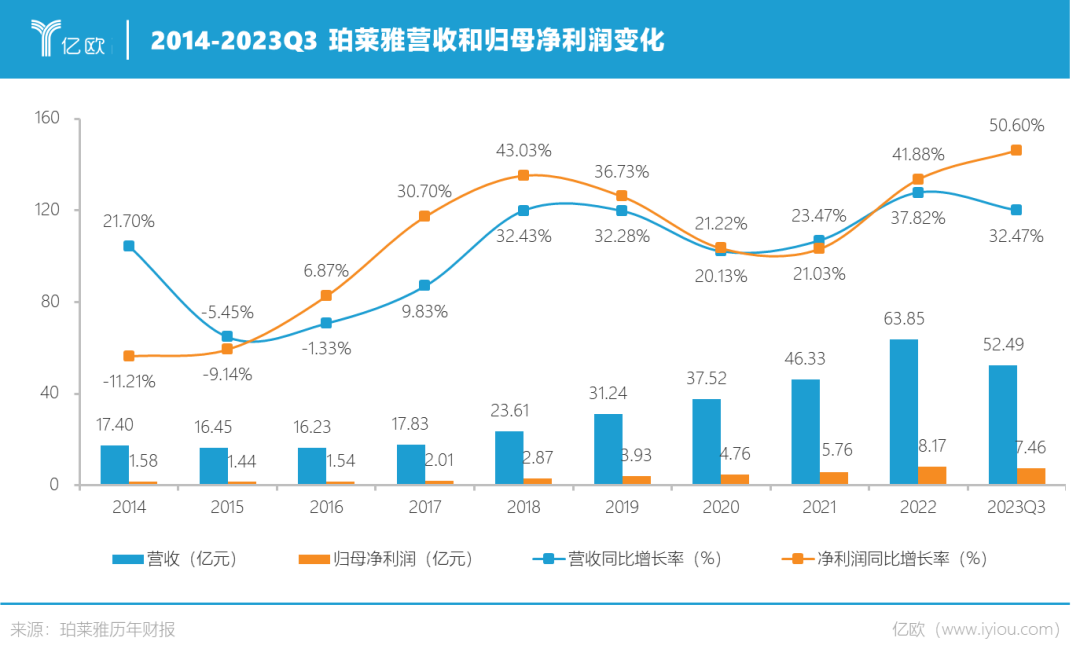 财报数据显示,2020-2022年,珀莱雅的营收分别为37.52亿元、46.33亿元、63.85亿元,归母净利润分别为4.76亿元、5.76亿元、8.17亿元;2023年刚过三个季度,珀莱雅的营收已达到52.49亿元,并首次登顶A股国货美妆公司营收TOP1。