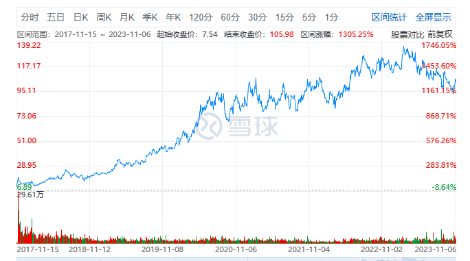经过几个时期的不断努力,珀莱雅的规模逐渐做大。2017年11月,珀莱雅以15.34元/股发行价登陆上交所,成为“国产美妆第一股”;上市后其股价一路攀升,于2022年5月突破百元大关;截至2023年11月6日收盘,珀莱雅股价106.02元/股,总市值超400亿元。