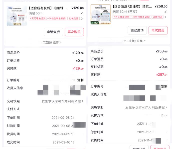 “灯塔”提到,直到2021年,自己关注的好几位抖音博主都陆续开始推荐这款防晒,“看着博主们的测评,确实觉得不错,就下单了。第一次买了一瓶,第二次因为买两瓶赠品多,更划算,所以就买了两瓶”。