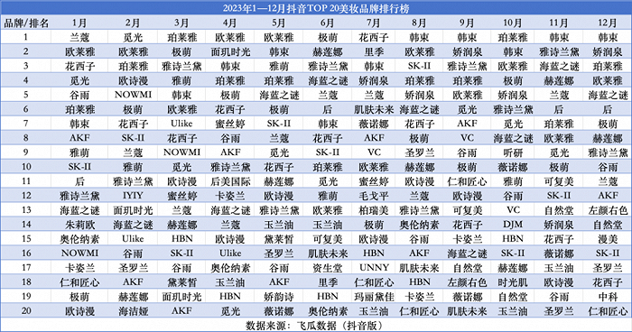 通过对“2023年1—12月抖音TOP 20美妆品牌排行榜”进行分析,仪美尚发现了以下几个特点: