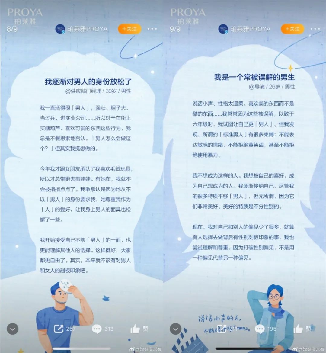 38临近,珀莱雅在官方微博发了一组海报,主题是#性别不是边界线偏见才是#(据说已经做了3年了,划个重点,下面详说),配了5位用户的故事。