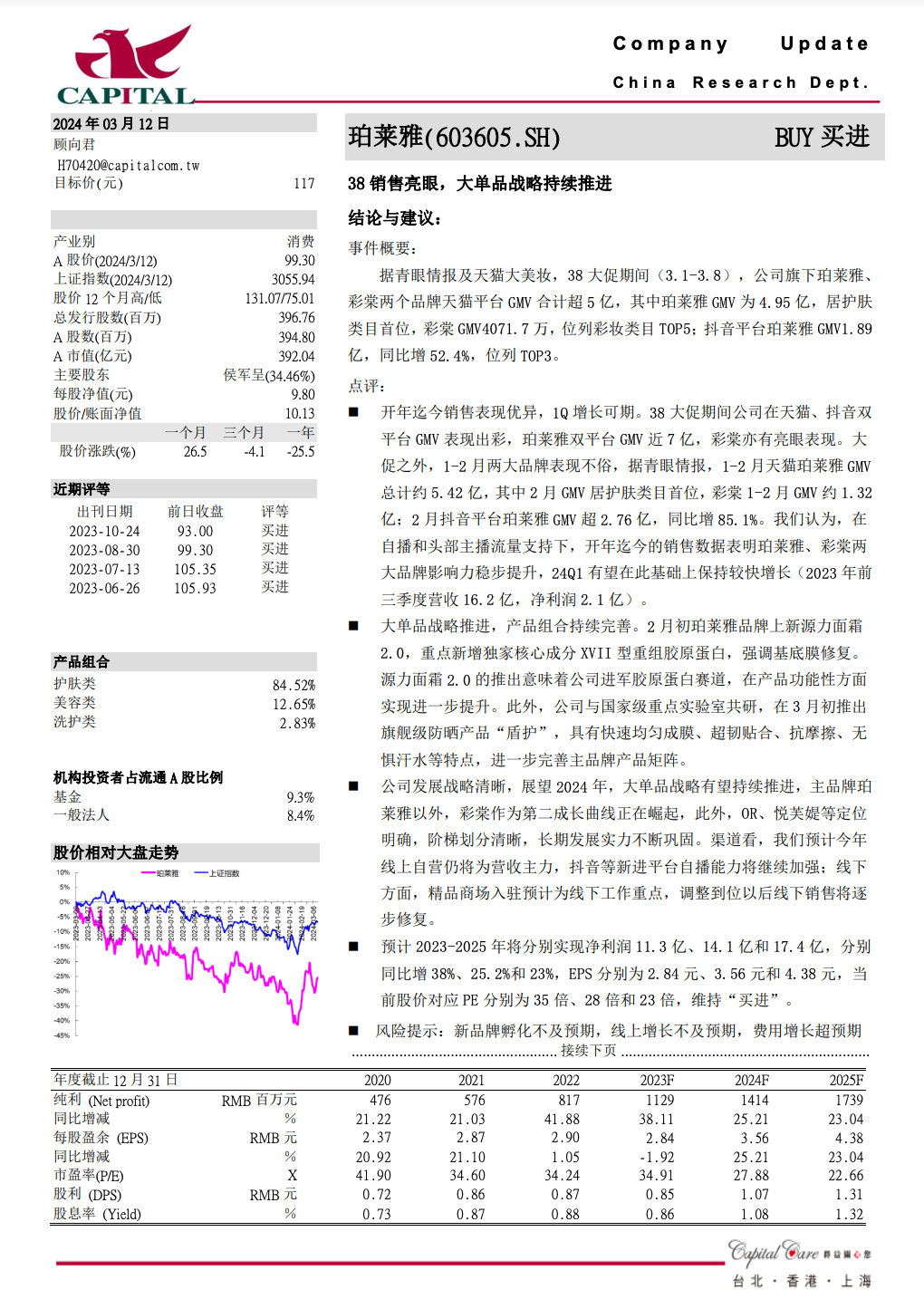 (1)珀莱雅:成交金额(以下简称“GMV”)获天猫美妆排名第1,同比增长30%+;抖音美妆排名第2,国货排名第1,同比增长100%+;京东美妆排名第4,国货排名第1,同比增长100%+。(统计时间:2月24日-3月8日)