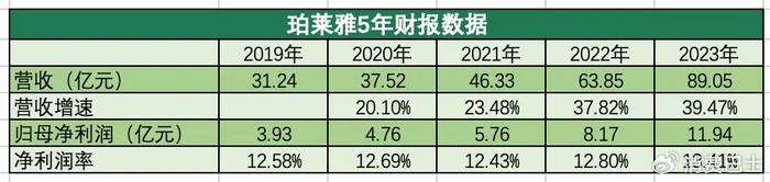 从2019年到2023年,珀莱雅的营收从31.24亿元涨到了89.05元,5年翻1.8倍,归母公司净利润则从3.93亿增加到了11.94亿,5年涨了两倍多。一般公司会随着规模变大增速放缓,但珀莱雅在2023年录得了5年来的营收最高增速,甚至比2020年的增速高出了近一倍。