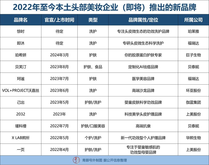 青眼号外进一步梳理发现,2022年来本土头部美妆企业至少推出的11个新品牌,其中洗护品牌占比近7成。不难预见,一场功效洗护大战打响。