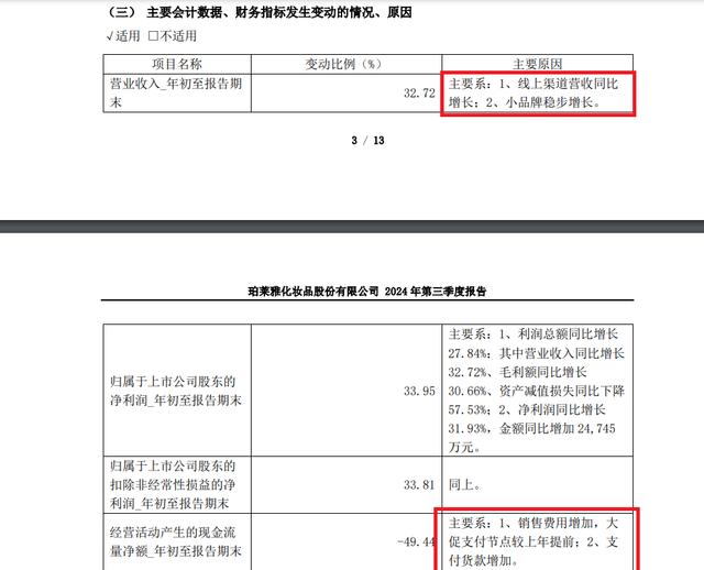 同时披露的2024年第三季度主要经营数据显示,护肤类(含洁肤)产品第三季度平均售价同比、环比上升,主要系单价较高的大单品(精华、面霜类)销售占比变动所致。