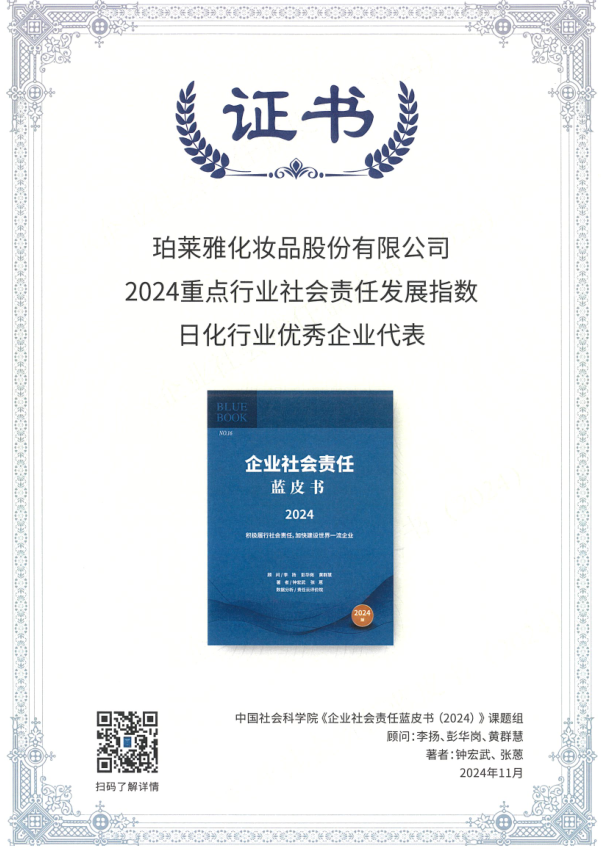 近期,由中国企业改革与发展研究会和责任云研究院主办的“ESG中国·第七届北京责任展”在北京召开。会上,中国社会科学院编制的《企业社会责任蓝皮书(2024)》发布,珀莱雅化妆品股份有限公司凭借在履行社会责任方面的优秀表现获评“日化行业社会责任发展指数优秀企业代表”。