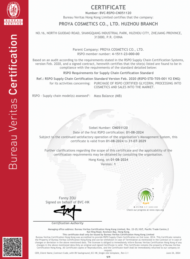 珀莱雅获RSPO供应链认证证书(来源:Bureau Veritas)