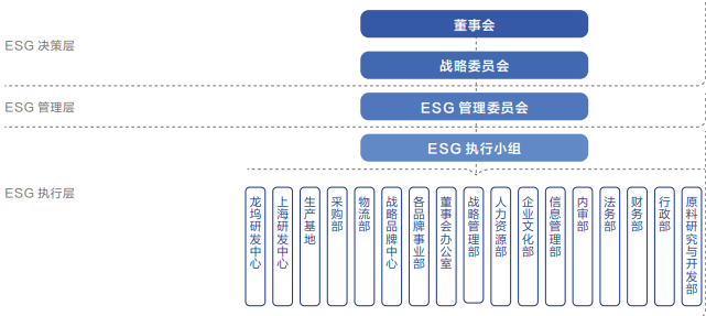 在公司治理层面,珀莱雅建立起了覆盖全公司的可持续发展及ESG组织架构,确保可持续发展及ESG工作高效推进。公司战略委员会总领全局,制定相关战略规划;下属的ESG管理委员会负责具体管理ESG重大项目以及相关成效考核,并定期向董事会战略委员会汇报;各职能部门单位构成ESG执行小组,实现上传下达和统筹兼顾。公司于2022年发布《珀莱雅可持续发展战略规划(2022-2025)》,包含面向2025、2030及2045年的温室气体排放目标。为实现这一目标,公司已初步建立起内部碳盘查管理机制,积极推动2025年碳达峰。此外,今年是珀莱雅第4年规范、全面、主动地披露在可持续发展及ESG治理方面所秉持的原则及达成的工作绩效,其包含社会环境等责任信息。在公司披露的《2023年度可持续发展暨环境、社会及公司治理(ESG)报告》中,我们首次披露了第三方权威机构出具的珀莱雅2023年温室气体核查声明及报告验证声明。
