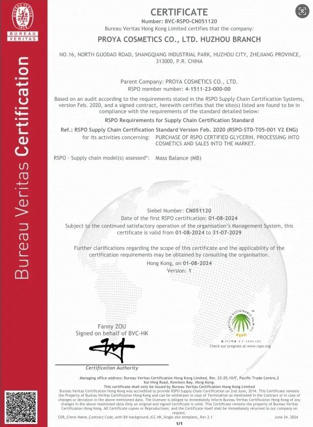 珀莱雅获RSPO供应链认证证书(来源:Bureau Veritas)