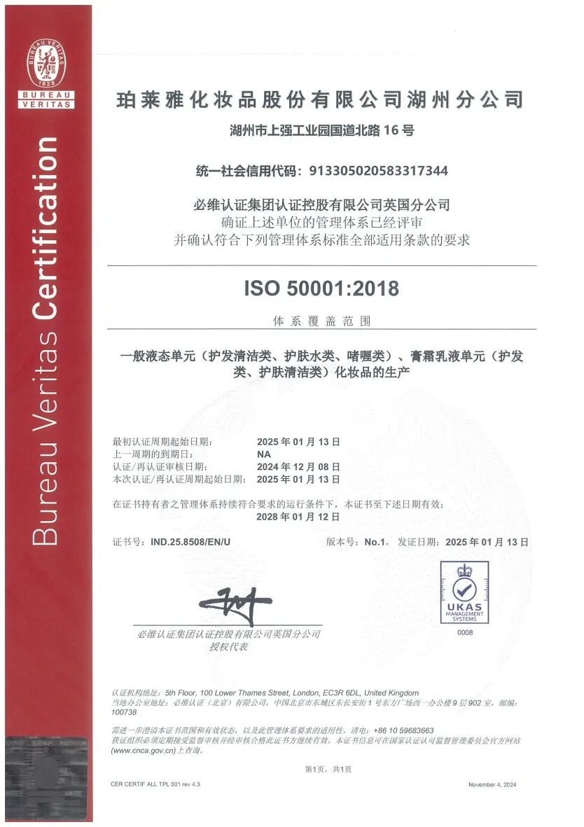 珀莱雅股份湖州分公司通过ISO50001能源管理体系认证
