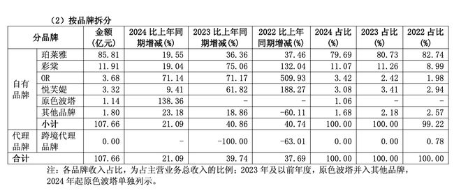 值得一提的是,从2024年起,珀莱雅公司将另一定位“眼部彩妆专家”的品牌“INSBAHA原色波塔”营收单独列示,其贡献营收1.14亿元,同比大增138.36%。