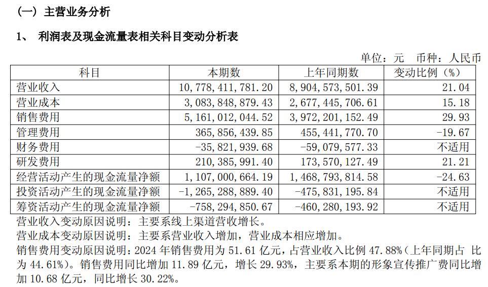 线上收入占比过高带来的另一挑战也不能忽视,2024年,珀莱雅的销售费用较2023年增长了29.93%,占当年营业收入的47.88%。对于销售费用同比增加,珀莱雅表示主要是因为形象宣传推广费同比增加30.22%导致的。