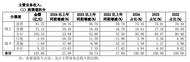 财报显示,2024年,珀莱雅实现营业收入107.78亿元,同比增长21.04%;归属于上市公司股东的净利润15.52亿元,同比增长30%。营业收入和归属于上市公司股东的净利润均实现两位数增长,珀莱雅的成绩看起来不错,但是,2022年,这两项指标的同比增速分别为37.82%和47.88%,2023年,这两个数字分别为39.45%和46.06%。与2022年和2023年相比,珀莱雅的营业收入和归属于上市公司股东的净利润的增速都在放缓。