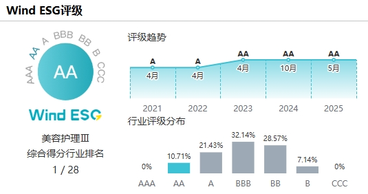 在权威性与专业性备受认可的 Wind ESG 评级体系下,连续三年稳居行业第一,彰显了珀莱雅可持续发展战略的扎实落地。锚定“未来十年跻身全球化妆品行业前十”的“双十”战略愿景,珀莱雅将继续秉持ESG管理理念,进一步完善可持续发展管理体系,向着更高的目标稳步迈进。