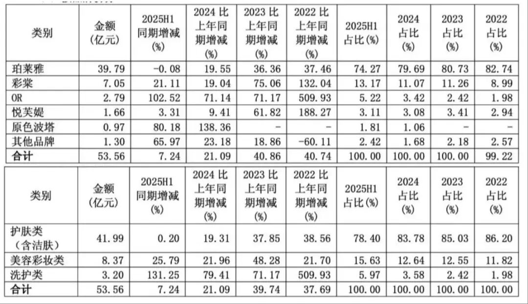 珀莱雅品牌的收入在2022年、2023年都是同比超过36%的增幅,2024年下降至同比19.55%的增幅,而2025年上半年,珀莱雅品牌同比出现微幅下滑约0.08%,这也是近5年以来珀莱雅品牌首次出现的营收增速下滑。