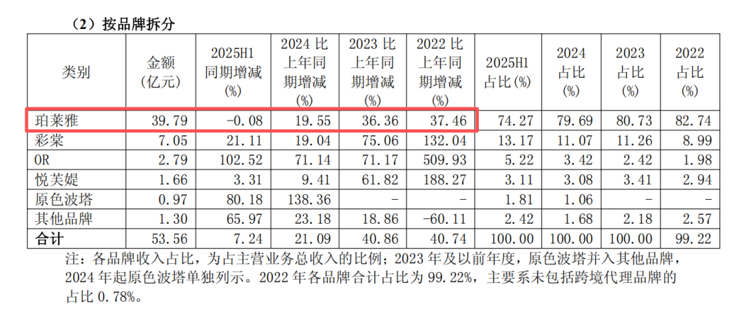 尤其是主品牌珀莱雅,增长已经停滞,上半年收入同比下滑0.08%。而2022年-2024年上半年,品牌的同期增速分别为37.46%、36.36%和19.55%。