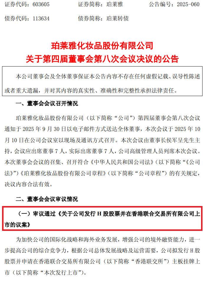 2025年10月10日,上交所主板上市公司珀莱雅(603605.SH)发布《关于第四届董事会第八次会议决议的公告》。公告显示,金昶担任财务负责人。该公告同时宣布董事会已审议通过了公司发行H股股票并在港交所上市的议案。