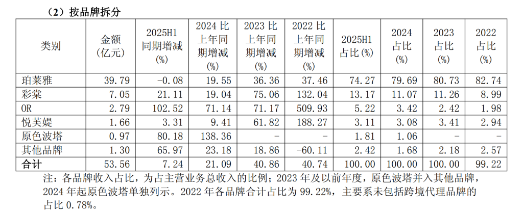2025年上半年,彩妆品牌彩棠营收7.05亿元,同比增长21.11%;洗护品牌OR表现亮眼,营收2.79亿元,同比激增102.52%。然而,这两个增长最快的品牌合计仅占营收的18.4%,体量尚小,对整体业绩拉动有限。悦芙媞和原色波塔等品牌规模更小,上半年营收分别为1.66亿元和0.97亿元。