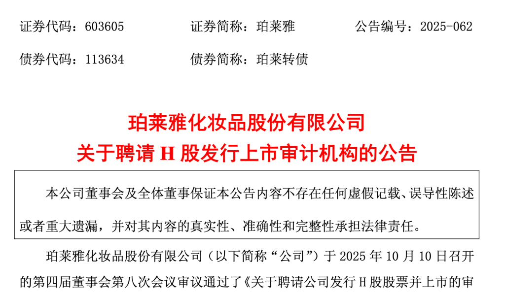 近日,国货美妆龙头企业珀莱雅发布《珀莱雅化妆品股份有限公司关于聘请H股发行上市审计机构的公告》,显示董事会审议通过了发行H股股票并上市的议案,计划于10月27日召开2025年第二次临时股东大会,对上述事宜进行最终审议。