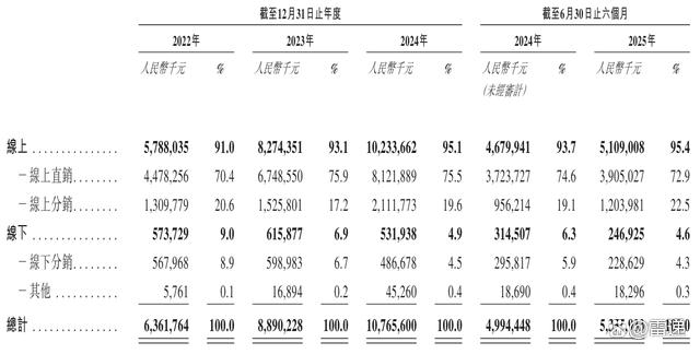珀莱雅收入主要来自线上,2025年上半年来自线上收入的占比高达95.4%,其中,线上直销收入为39亿元,占比为72.9%;来自线上分销收入占比为12亿元,占比为22.5%。