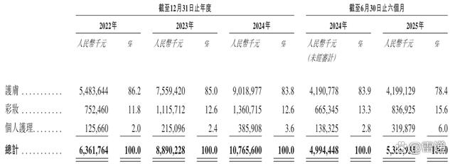 珀莱雅2025年上半年来自护肤收入为42亿,占比为78.4%;来自彩妆收入为8.37亿,占比为15.6%;来自个人护理收入为3.2亿元,占比为6%。