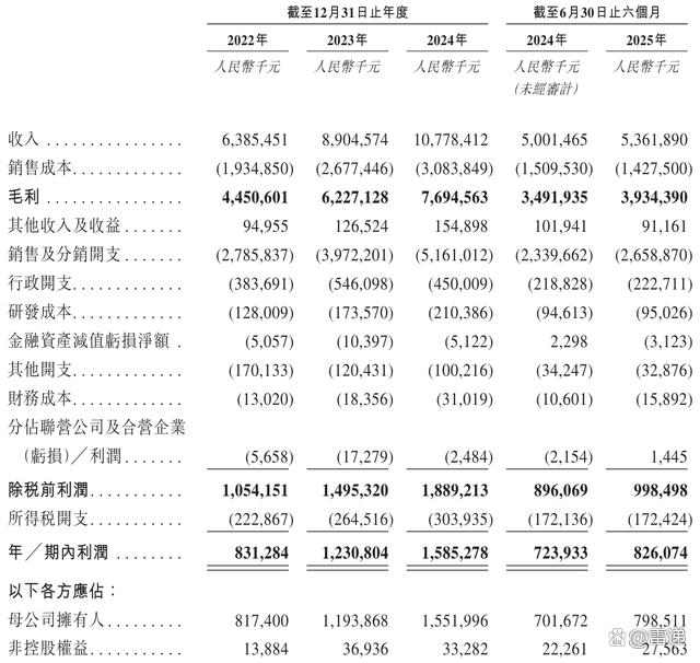 招股书显示,珀莱雅2022年、2023年、2024年营收分别为63.85亿元、89亿元、107.78亿元;毛利分别为44.51亿元、62.27亿元、76.95亿元;期内利润分别为8.31亿元、12.31亿、15.85亿元。