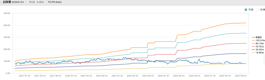 从市赚率(PR,即PE/ROE)来看, 珀莱雅 当前PR为0.68倍,已经处于相对低估的水平,股息率1.77%((按上年分红1.19元*0.5+年中分红0.8元)/股价)。与国内A与H股上市的美护公司来看,PR处于最低值,远低于 贝泰妮 的8.81倍(25年半年报营收与净利润双双降)。