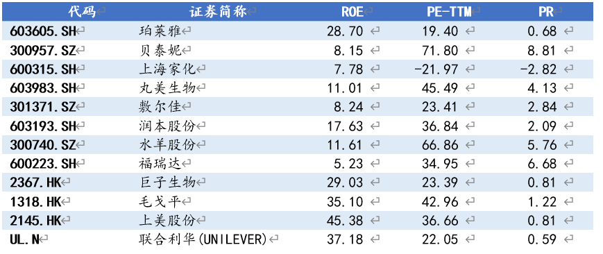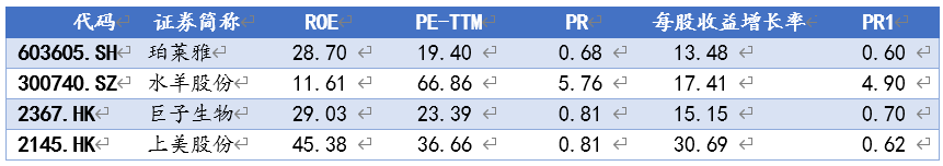 图:美护上市公司修正后的PR对比,注:PR1=PE/(ROE*(1+每股收益增长率*1%))
