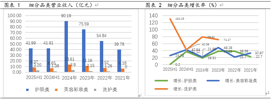 在护肤类营收增速渐缓时,公司彩妆及洗护类营收放量,获得第二增长曲线。