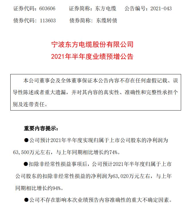 7月9日讯昨晚,东方电缆(603606.SH)发布2021年半年度业绩预增公告。公司预计2021年半年度实现归属于上市公司股东的净利润为6.35亿元左右,与上年同期相比增长约74%。扣除非经常性损益事项后,公司预计2021年半年度归属于上市公司股东的扣除非经常性损益的净利润为6.30亿元左右,与上年同期相比增长约94%。