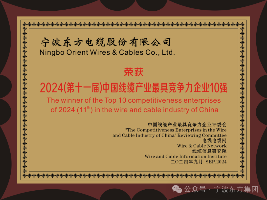 昨日,“2024年度中国线缆产业最具竞争力企业”授牌仪式在上海隆重举行。来自全国各地的线缆行业杰出代表齐聚一堂,共同庆祝并见证这一荣耀时刻。东方电缆凭借过硬的实力连续4次荣登“中国线缆产业最具竞争力企业10强”榜单。本届位次上升1位。