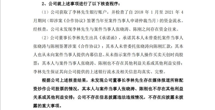 (1)公司获取了李林银行账户,并检查了自2018年1月至2021年4月期间(即涉案《合作协议》签署当年至案件当事人申请仲裁当月)的资金流水。经核查,公司未发现李林先生与案件当事人张晓涛、陈刚之间存在资金往来。