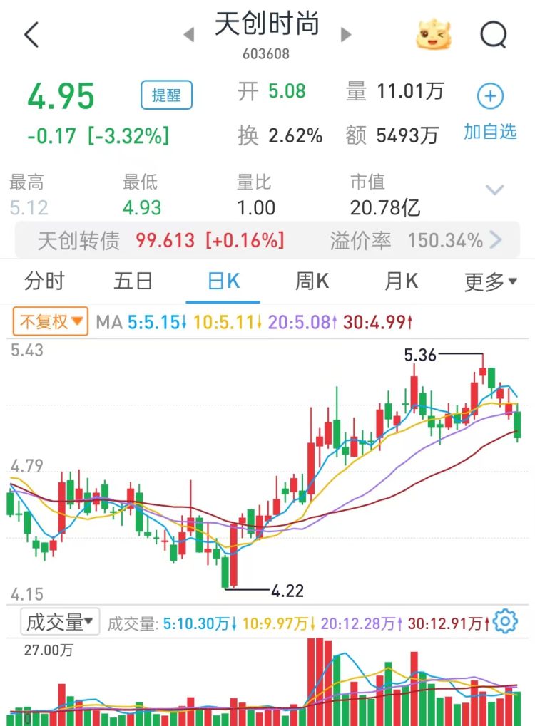 二级市场上,天创时尚8日收盘报4.95元/股,跌3.32%,最新总市值20.78亿元。