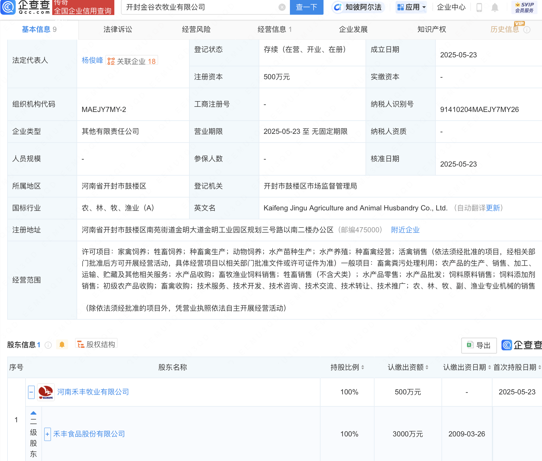 企查查APP显示,近日,开封金谷农牧业有限公司成立,法定代表人为杨俊峰,经营范围包含:家禽饲养;牲畜饲养;种畜禽生产;动物饲养;水产苗种生产等。企查查股权穿透显示,该公司由禾丰股份(603609)间接全资持股。