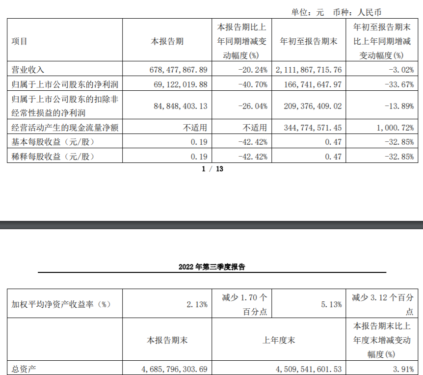 据公告,2022年第三季度,麒盛科技营业收入6.78亿元,同比降20.24%;归属于上市公司股东的净利润6912.2万元,同比降40.7%。前三季度,麒盛科技营业收入21.12亿元,同比降3.02%;归属于上市公司股东的净利润1.67亿元,同比降33.67%。