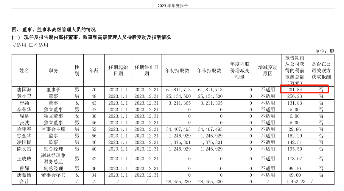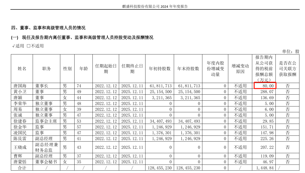 能看出来,麒盛科技有意减少对大客户的依赖程度。翻阅财报,乐居财经发现,去年董事长唐国海降薪超过百万。2023年其薪酬为201.84万元,2024年则为80万元,薪酬降了121.84万元。值得关注的是,唐国海并不存在从公司关联方获取报酬的情况。