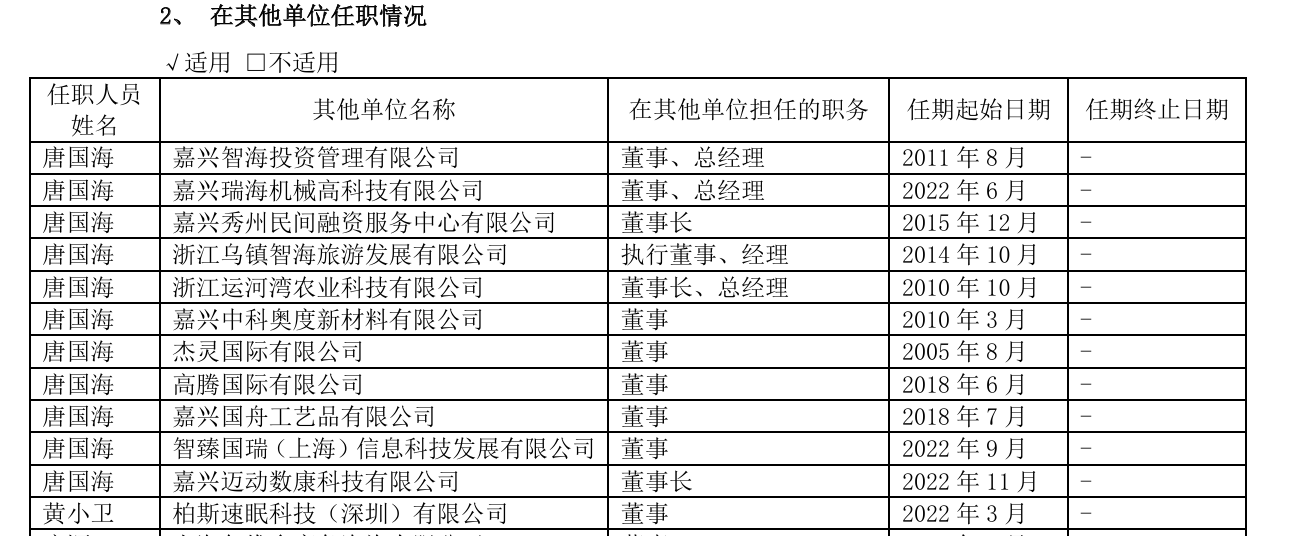 唐国海除了在麒盛科技任职,他还在其他单位有任职。财报披露,目前其在外任职的企业有11家,涉及投资管理、农业科技、民间融资、旅游等领域。