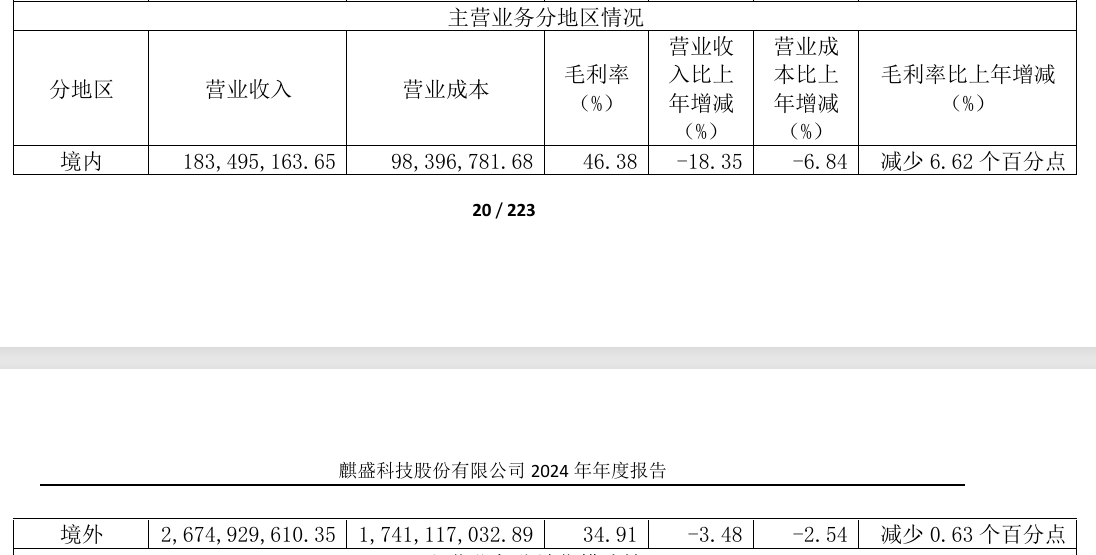 境外收入占比在九成以上,2024年营收比重未减反增。财报显示,2024年,麒盛科技境外收入金额约为26.75亿元,占主营业务收入比例93.58%。