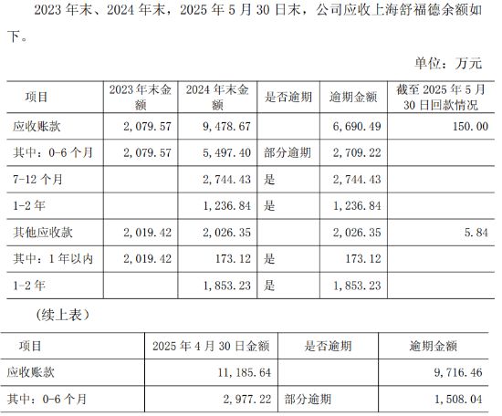 2023年至2024年,麒盛科技向上海舒福德销售智能床、床垫等产品的总金额分别为2237.31万元和8304.86万元,各期应收账款余额分别为2079.57万元和9478.67万元。截至2024年末,上海舒福德的净资产已为-6979.62万元,在此背景下,公司对上海舒福德的应收账款中,逾期金额高达6690.49万元;对上海舒福德2026.35万元的其他应收款也已全部逾期。