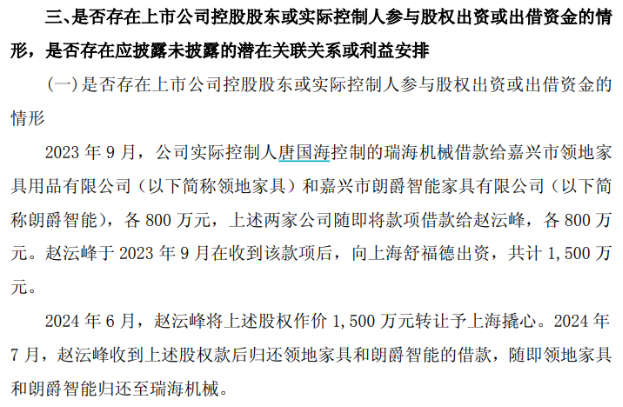 首先,赵沄峰缺乏足够资金参与“舒福德”品牌的国内推广,其参与设立上海舒福德的1500万元系2023年9月向领地家具和朗爵智能分别借款800万元所得,彼时前述两家公司考虑到赵沄峰的还款能力,要求唐国海提供资金保证后方能借款,但实际资金流转路径却是,唐国海控制的瑞海机械借款给前述两家公司各800万元,两家公司随即将款项借款给赵沄峰,由此后者才向上海舒福德出资。