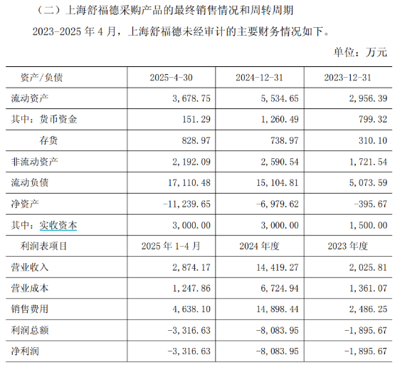 记者了解到,原因之一在于,麒盛科技看重上海舒福德股东——上海撬心的专业营销能力,后者曾服务过多家国内品牌。然而,即便拥有上海撬心加持,上海舒福德的业绩依旧未能有效改善,2023年、2024年以及今年1至4月,上海舒福德实现营收分别为2025.81万元、1.44亿元和2874.17万元,各期净利润分别亏损1895.67万元、8083.95万元和3316.63万元。