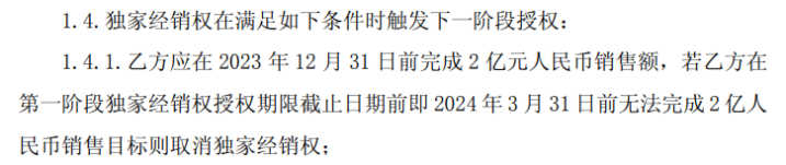 值得注意,麒盛科技与上海舒福德签订的《独家经销合同》显示,乙方(上海舒福德)应在2023年末前销售额达到2亿元,若乙方在2024年3月末前无法完成2亿元销售目标则取消独家经销权。