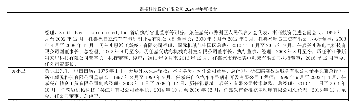 2024年财报中显示,黄小卫生于1975年,本科学历,自2016年12月起至今,黄小卫一直担任 麒盛科技 的董事、总经理,可以说,他深度参与了公司上市至今的很多重要决策。