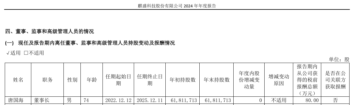 唐国海卸下董事长身份,手中实权没有让。目前,唐国海持有 麒盛科技 58,361,713股股份,持股比例约16.53%。